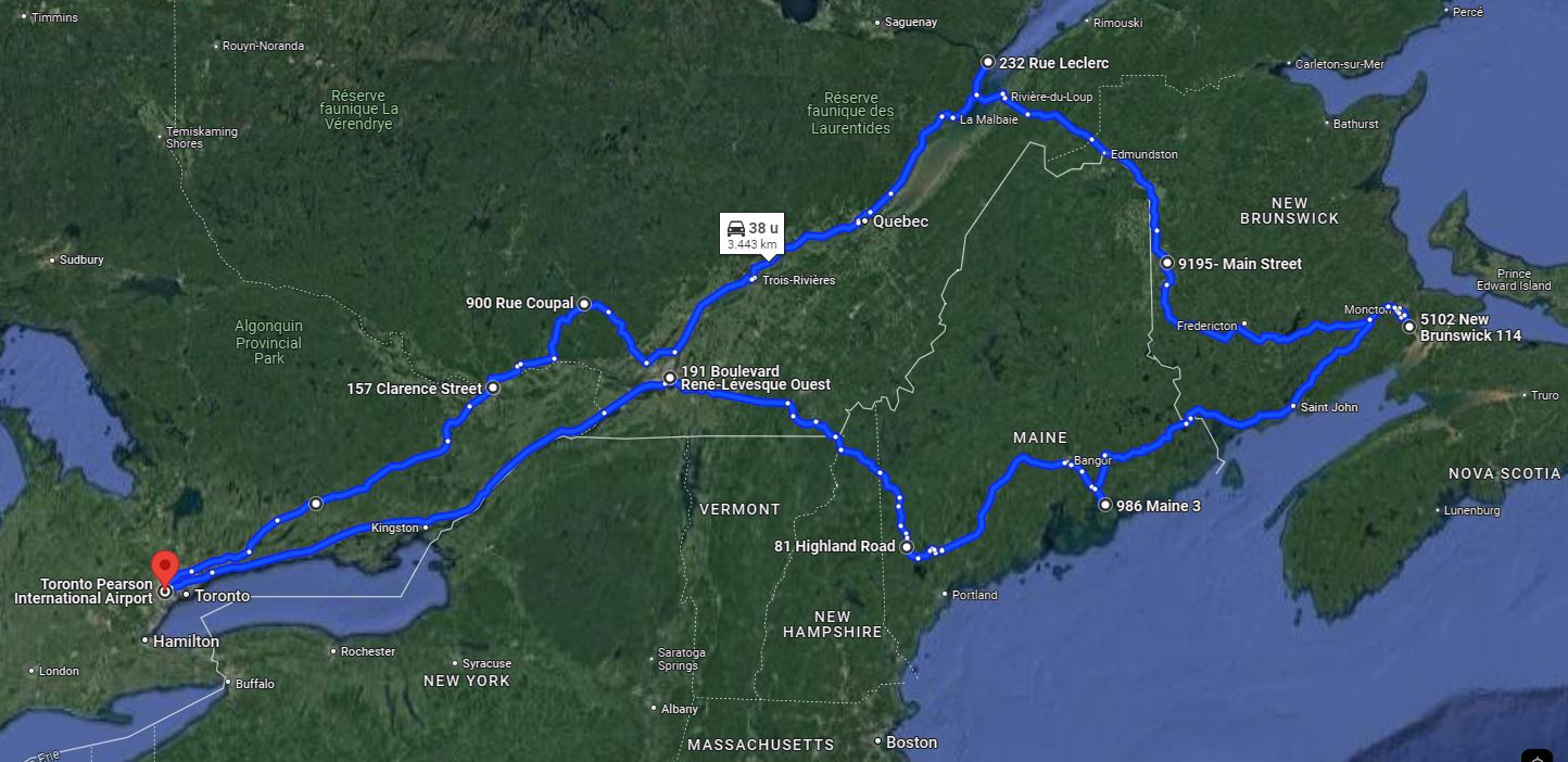 Dit jaar gaan we naar Oost Canada en pakken we een klein stukje van Amerika mee. We vliegen rechtstreeks van Amsterdam naar Toronto en halen daar meteen de huurauto op. In Canada gaan we naar de staten Ontario, Quebec en New Brunswick en in Amerika de staten Maine, Vermont en New Hampshire. De route gaat globaal Toronto - Peterborough - Ottawa - Mont Tremblant - Quebec - Baie Sainte Catherine - Florenceville Bristol - Shepody - Sait John - Bar Harbor - Bridgton - Magog Orford - Montreal - Belleville - Toronto.