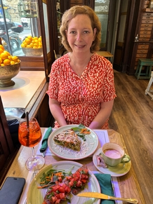 Intussen was het helemaal opgehouden met regenen. Het was nog wel bewolkt en dat maakte dat het vandaag toch iets koeler aanvoelde. Bij een oude apotheek die omgebouwd was tot lunchcafé aten we lekker bruschetta en quiche.