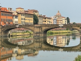 Een stukje verderop liepen we naar de Ponte Santa Trinita en de Ponte Vecchio. Deze laatste is de bekendste van de vele bruggen uit Florence. Deze middeleeuwse brug staat vol met houten huisje met goudsmeden en juweliers.