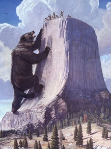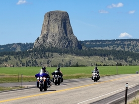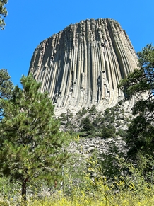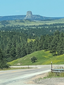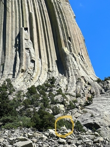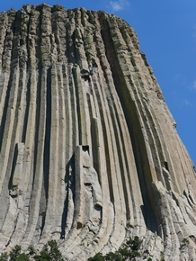 De volgende stop was bij Devils Tower National Monument, bekend van de oude sciencefiction film Close encounters of the third kind. Wat een gigantische monoliet, we zagen hem al van veraf liggen, maar pas toen we er een stuk omheen liepen zagen we hoe groot hij werkelijk is met enorme verticale groeven. Er waren wat mensen op geklommen en die zag je bijna niet. Kijk op de foto maar eens het gele stipje in de cirkel.
