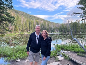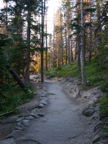 Na een tijdje begonnen we weer aan de afdaling terug naar Bear Lake. Dit ging een stuk gemakkelijker en sneller. Al met al hebben we er iets minder dan drie uur over gedaan. Het begon nu ook erg warm en vooral ontzettend druk te worden, dus we hadden zeker geen spijt van onze vroege tocht. We reden weer terug naar beneden en nu zagen we de omgeving in het licht. Wat een mooie weg met in de verte de besneeuwde hoge pieken van de Rocky Mountains. Daar gaan we morgen heen.Terug in Estes Park dronken we bij een gezellig koffiezaakje lekkere ijskoffie op fijne stoelen aan het riviertje dat door Estes Park stroomt. Dat hadden we wel verdiend vonden we na zo'n lange wandeling.