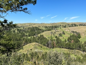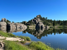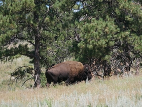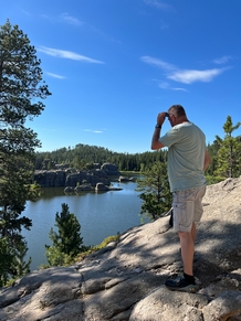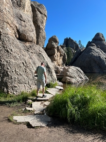 Weer een "bizon"dere dag vandaag. We keken eerst in onze cabin de start van de Formule 1 in Spa, daarna mocht Max nog even mee naar het ontbijt. We zagen hem pole-position terug veroveren, maar toen moesten we toch echt op pad. We reden Custer State Park binnen bij Sylvan Lake. Een mooi meeer tussen de grillige rotsen van de Black Hills. We liepen een trail om het meer heen waarvoor we nog flink moesten klimmen en klauteren, maar daar draaien wij na de Rocky Mountains onze hand niet meer voor om.