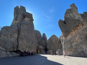 Na deze mooie wandeling stapten we snel weer in onze auto met de airco lekker aan om de Needles Highway te gaan rijden in het park met zijn naaldvormige rotsen. Al snel kwamen we bij Needles Eye tunnel en die deed zijn naam helemaal eer aan. De hoge rots naast de tunnel leek echt op een naald met een oog erin. De tunnel was ontzettend smal en er mag dan ook maar één auto of motor tegelijk doorheen. Gelukkig wachtte iedereen netjes op elkaar. De weg slingerde verder tussen de meest bizarre rotsformaties door.