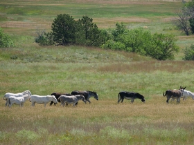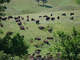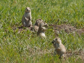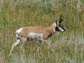 Aan het einde van de weg draaiden we de Wildlife Loop op. Hier geen rotsen meer, maar glooiende groene heuvels. Al snel zagen we een antilope langs de weg en een stuk verderop een kudde wilde ezels. Weer wat verderop enorm veel prairiehondjes, wat zijn die dieren snel en moeilijk te fotograferen, maar wat zijn ze schattig. Even dachten we dat we de bizons die in dit park leven niet meer tegen zouden komen, maar ineens was daar een gigantische kudde op de heuvel. Zoveel hebben we er nog nooit bij elkaar gezien en als kers op de taart kwam er ook nog eentje vlakbij onze auto lopen. Wat een imposante beesten.