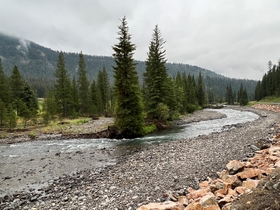 We gingen op weg naar het Norris Geyser Basin, maar helaas begon het te regenen. We liepen toch een klein stukje langs de mooie pastelblauwe poelen, maar hielden het door de regen al snel voor gezien.